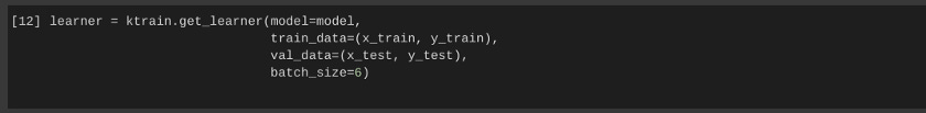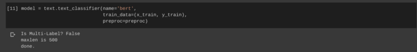 Training the BERT model happens through the “learner” function present in the ktrain library.