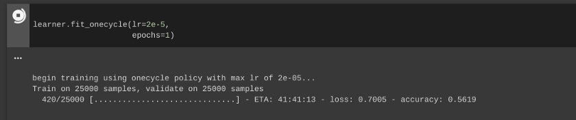 The Training is on 25000 movie review samples and it will be validated on 25000 validation samples. As you can see above, the ETA to completely train and validate 25000 samples is about 41 mins with TPU. This doesn’t even run on GPU. I’ll update the validation accuracy screenshot of BERT once the training and validation is completed.