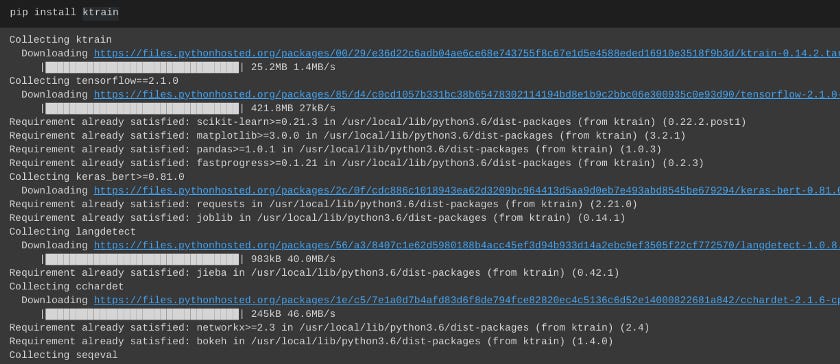 Step 1: Install ktrain library (Although most of the libraries are pre-installed on Google Colab, some are not :(.. )