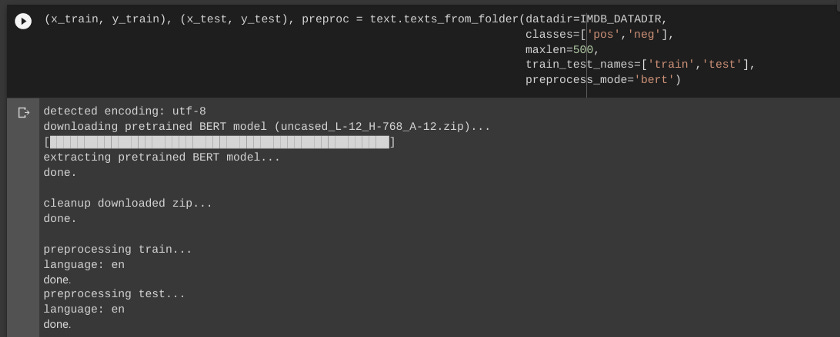 In order to create the test and train set for BERT, “text” function in the ktrain library plays a prominent role. It helps to separate the texts into 2 classes in our case (Positive reviews and Negative Reviews). ktrain is a wrapper around Keras.