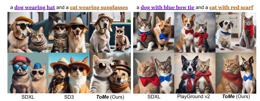 The authors introduce Token Merging (ToMe), a novel approach that enhances semantic binding by merging relevant tokens into a single composite token, ensuring that objects, their attributes, and sub-objects share the same cross-attention map. To handle potential ambiguity in complex prompts, end token substitution is proposed as a complementary strategy. Additionally, two auxiliary losses—entropy loss and semantic binding loss—are introduced early in the T2I generation process to refine layout determination and composite token alignment, thereby improving generation accuracy. Extensive experiments validate ToMe’s effectiveness, especially in complex scenes involving multiple objects and attributes, where existing methods often fall short. Comparisons on the T2I-CompBench and a new GPT-4o object binding benchmark confirm its advantages.
