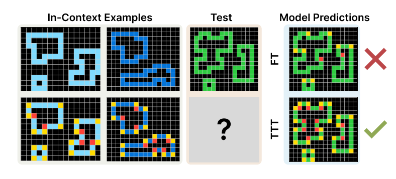 Systematic experimentation reveals three essential factors for effective TTT: (1) initial fine-tuning on similar tasks, (2) the use of auxiliary task formats and augmentations, and (3) per-instance training. TTT enhances ARC task performance significantly, yielding up to a sixfold accuracy improvement over base fine-tuned models. Applied to an 8-billion-parameter language model, TTT achieves 53% accuracy on ARC’s public validation set, raising the state-of-the-art by nearly 25% for public, purely neural models. Ensembling TTT with recent program generation approaches further boosts public validation accuracy to 61.9%, on par with the average human score.