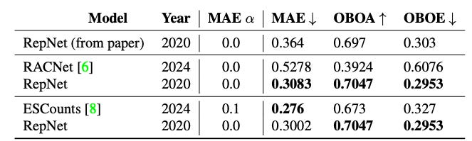 Summary: Several studies report that the RepNet model underperforms on certain repetition counting datasets. This issue was initially noted in the TransRAC paper, where a modified version of RepNet was tested. In Section 5.3, TransRAC details that the final fully connected layer of RepNet was altered to manage videos with more than 32 action periods, though the specifics of this modification are not clear. This change significantly reduced the model’s Off-by-One Accuracy (OBOA) on UCFRep and RepCount datasets, suggesting that the modified model could not accurately count repetitions in these datasets. Subsequent studies used these results from TransRAC but attributed them to RepNet, rather than the modified version.